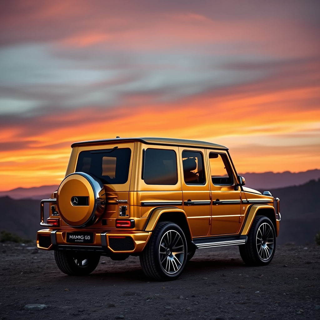 A gleaming golden Mercedes AMG G 63 parked majestically against a breathtaking sunset backdrop, its lustrous surface reflecting the rich hues of twilight. The iconic SUV stands on a rugged terrain, surrounded by a picturesque landscape of rolling hills and distant mountains. The scene captures the essence of luxury and adventure, as soft evening light dances across the sleek contours of the vehicle, highlighting its formidable presence and intricate design.