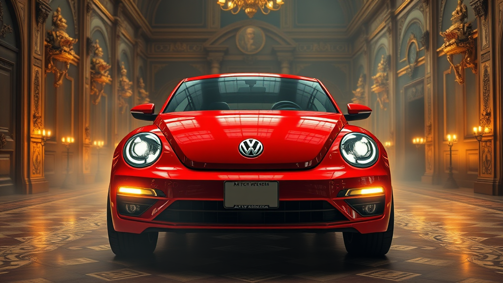 A gleaming red Volkswagen Beetle in the latest model outline, reimagined in an intricate steampunk style, sits with glowing headlights like twin beacons within the grand halls of an opulent, ancient palace. The highly polished exterior reflects the lavish surroundings, casting shimmering patterns on the ornate walls. It is enveloped in an eerie yet inviting atmosphere where soft fog weaves through the cavernous space, whispering of past splendor. The beetle, a curious blend of modern innovation and Victorian fantasy, exudes a sense of hygge, its mechanical features adorned with brass fittings and intricate gears. The air is thick with mystery, illuminated by the scattering of golden light and shadow, drawing you into a world where the past and future collide in a harmonious dance reminiscent of a living Artgerm masterpiece.