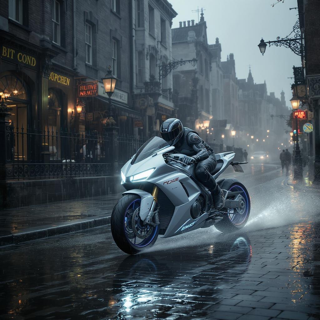 A gleaming white motorcycle races down a cobblestone street, its futuristic design cutting through the Victorian-era ambiance. It speeds past flickering gas-lit street lamps and intricate wrought-iron fences, the rider leaning forward with determination, hands gripping the handlebars tightly. The bike's headlights pierce through the misty air, illuminating the path ahead with a bright beam. Surrounding the scene, the ornate facades of Victorian architecture and vintage shop signs create a stark contrast with the modern vehicle, crafting a surreal blend of time periods. Light drizzle leaves puddles on the street, reflecting the neon glow from the bike, enhancing the cinematic and atmospheric vibe of the moment.