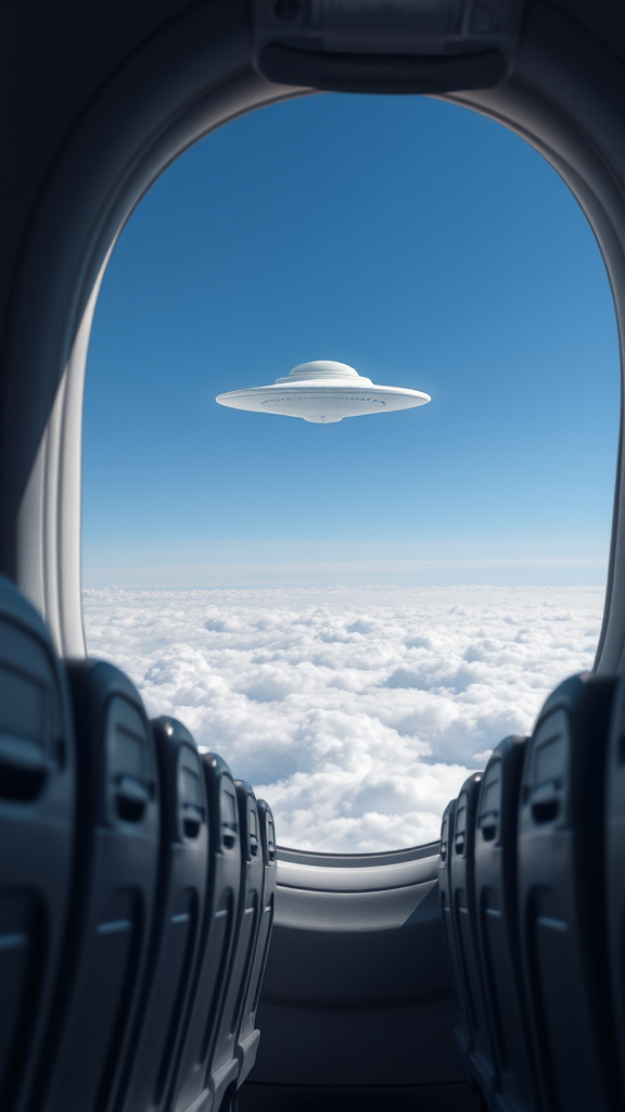 A glimpse from the cabin of a passenger airplane reveals a tapestry of white, fluffy clouds below, while a mysterious UFO hovers subtly in the sky, framed elegantly through the rounded window, with rows of seats lining the aisle casting soft shadows.