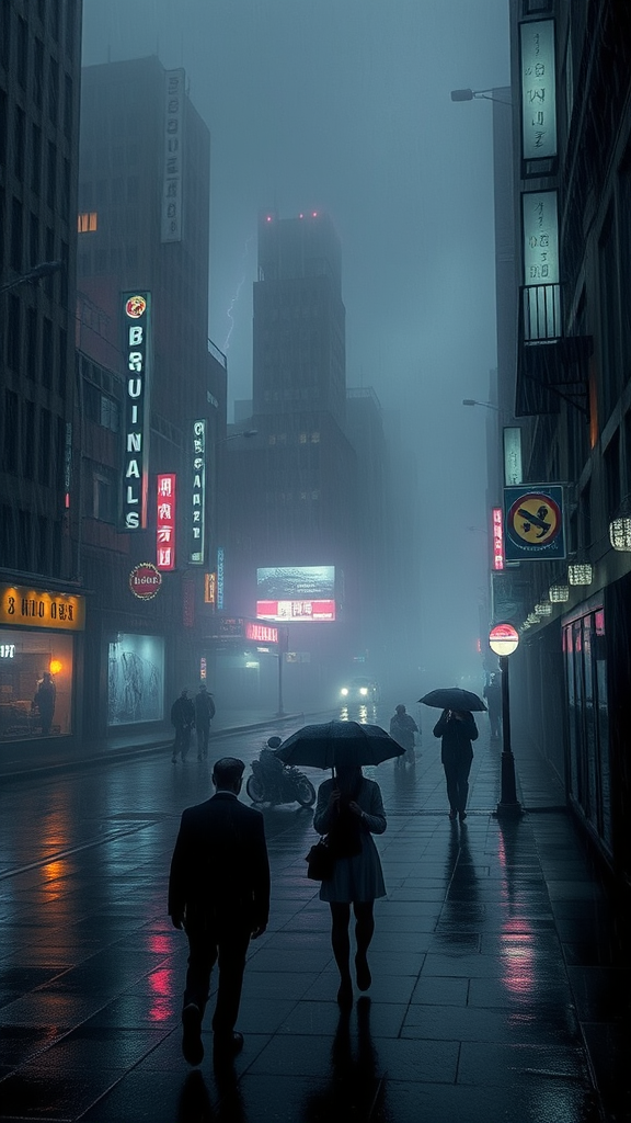 A gloomy, rain-soaked metropolis shrouded in mist, illuminated by the occasional flicker of neon lights reflecting off slick pavements, where shadowy figures move swiftly beneath umbrellas, and the distant rumble of thunder echoes through narrow alleys.