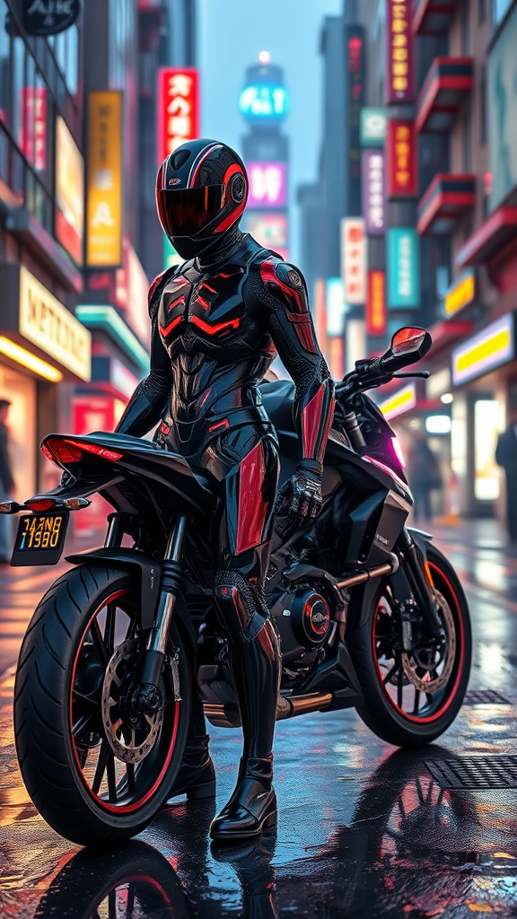 A glossy android adorned in a dark, advanced cybernetic exo-suit stands beside a high-tech motorcycle on a bustling cyberpunk city street, where vibrant neon lights cast dynamic reflections on the wet pavement. The scene is captured with a cinematic feel, employing unreal engine for a photorealistic, 3d render, captured in 32k. The android's sleek design and the motorcycle's intricate details are harmoniously integrated into the surrounding urban landscape, immersing the viewer into an expressive, dynamic visual narrative.