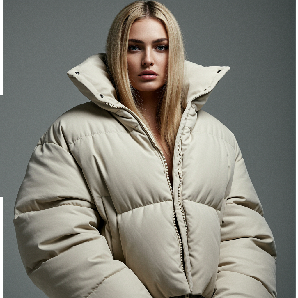A glossy fashion shoot portrait of a stunningly beautiful woman draped in an exaggeratedly oversized puffer jacket designed by iconic labels like Craig Green, Dingyun Zhang, Yeezy, Balenciaga, and Vetements. The image is sharply focused and exquisitely detailed, capturing a cinematic flair with a touch of glamour. The composition exudes symmetry and elegance, reminiscent of a high-fashion editorial spread for Vogue, showcasing a luxurious and stylish aesthetic with an off-white color palette.