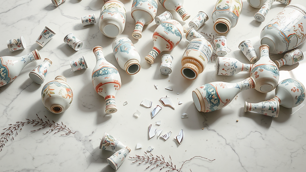 A glossy marble floor scattered with intricately painted porcelain bottles in soft pastel hues, each bottle adorned with elaborate designs, their patterns telling stories of beauty and craftsmanship; amidst them lies one fractured, revealing delicate shards glinting in the light, adding an unexpected element to the serene tableau.