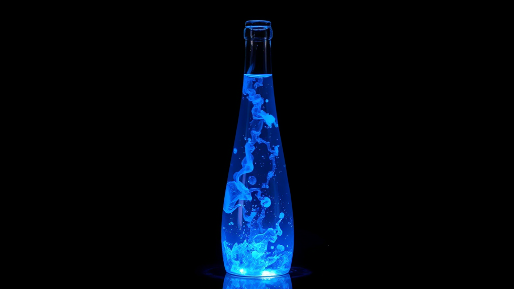 A glowing blue liquid swirling in a clear glass bottle, set against a deep black background, capturing the essence of mystery and intrigue; the elongated shape of the bottle accentuates its ethereal allure, as if holding a piece of the cosmos itself within, and the ambient light subtly highlights the intricate textures of the glass.