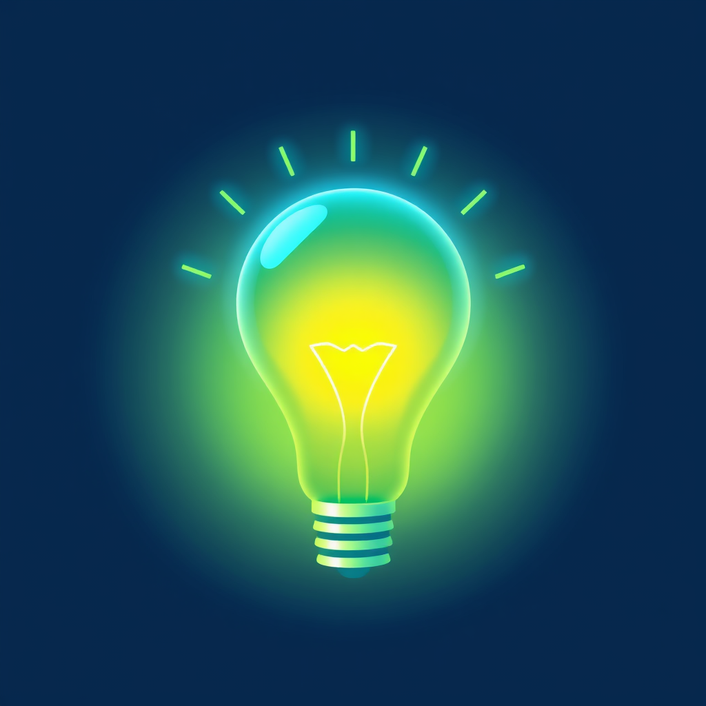 A glowing bulb icon with a soft yellow light radiating from its center, surrounded by subtle blue and green hues representing innovation and sustainability, with a sleek, minimalist design that emphasizes modernity and creativity.