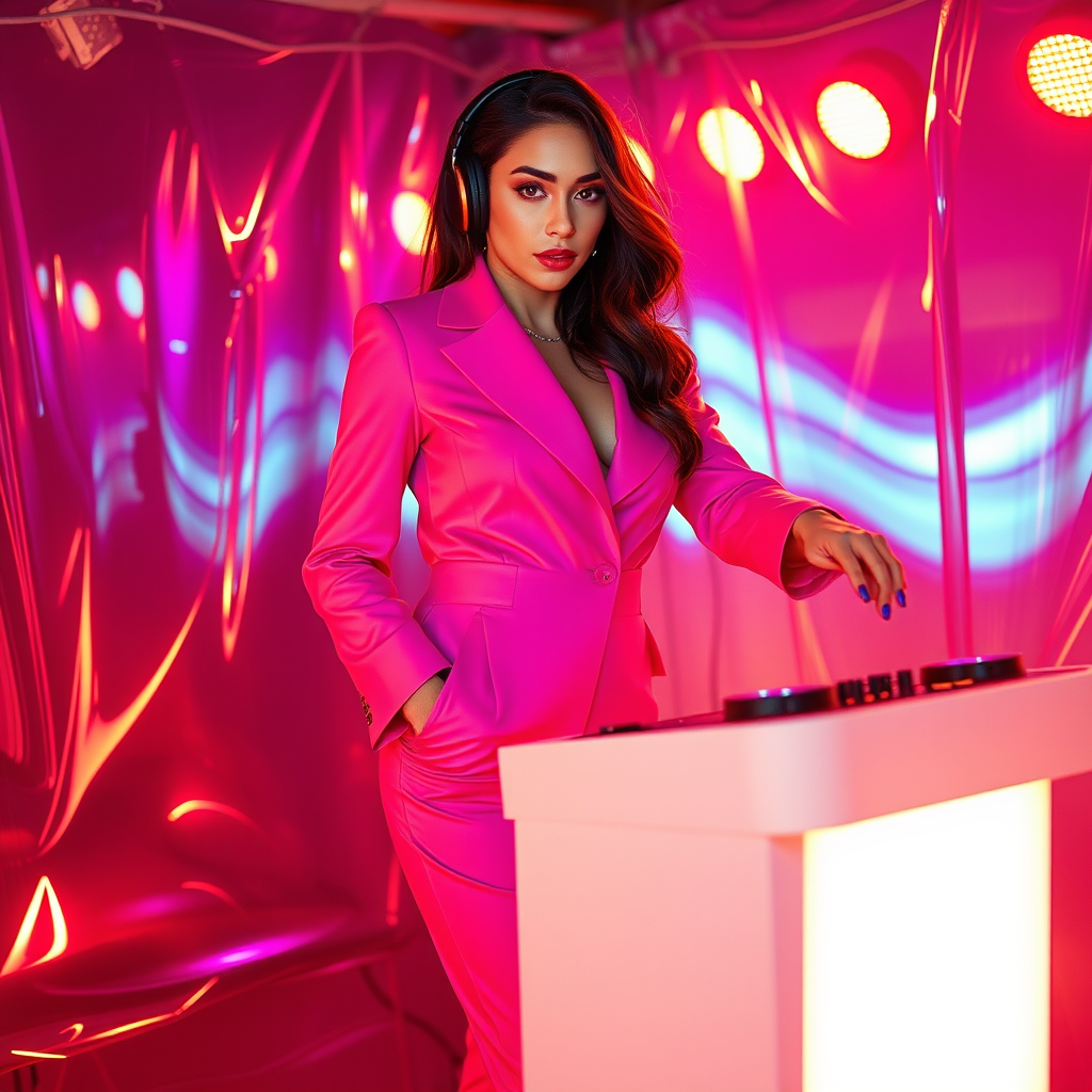 A glowing portrait of a woman in a vibrant pink ensemble stands confidently, her hand gently resting on a sleek white DJ stand as she adjusts her headphones. The scene exudes a sense of dynamic energy and creativity, capturing the essence of deconstructed tailoring with an array of wavy, fluid lines and warmcore hues. Her surroundings possess a shiny, reflective quality, enveloping her in an almost surreal ambiance reminiscent of Hannah Yata and Karol Bak's styles. The atmosphere is lively and inviting, filled with an artistic blend of textures and colors, set against an ambient video backdrop.