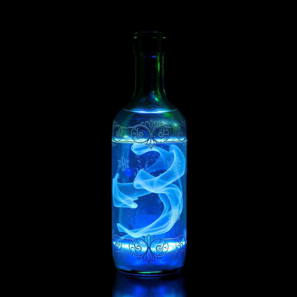 A glowing potion in a glass bottle sits against a dark background, its luminous liquid swirling within, casting subtle reflections. The elongated bottle is adorned with intricate etchings that catch the faint light in the dim ambiance, evoking a sense of ancient mystery and alchemical secrets.