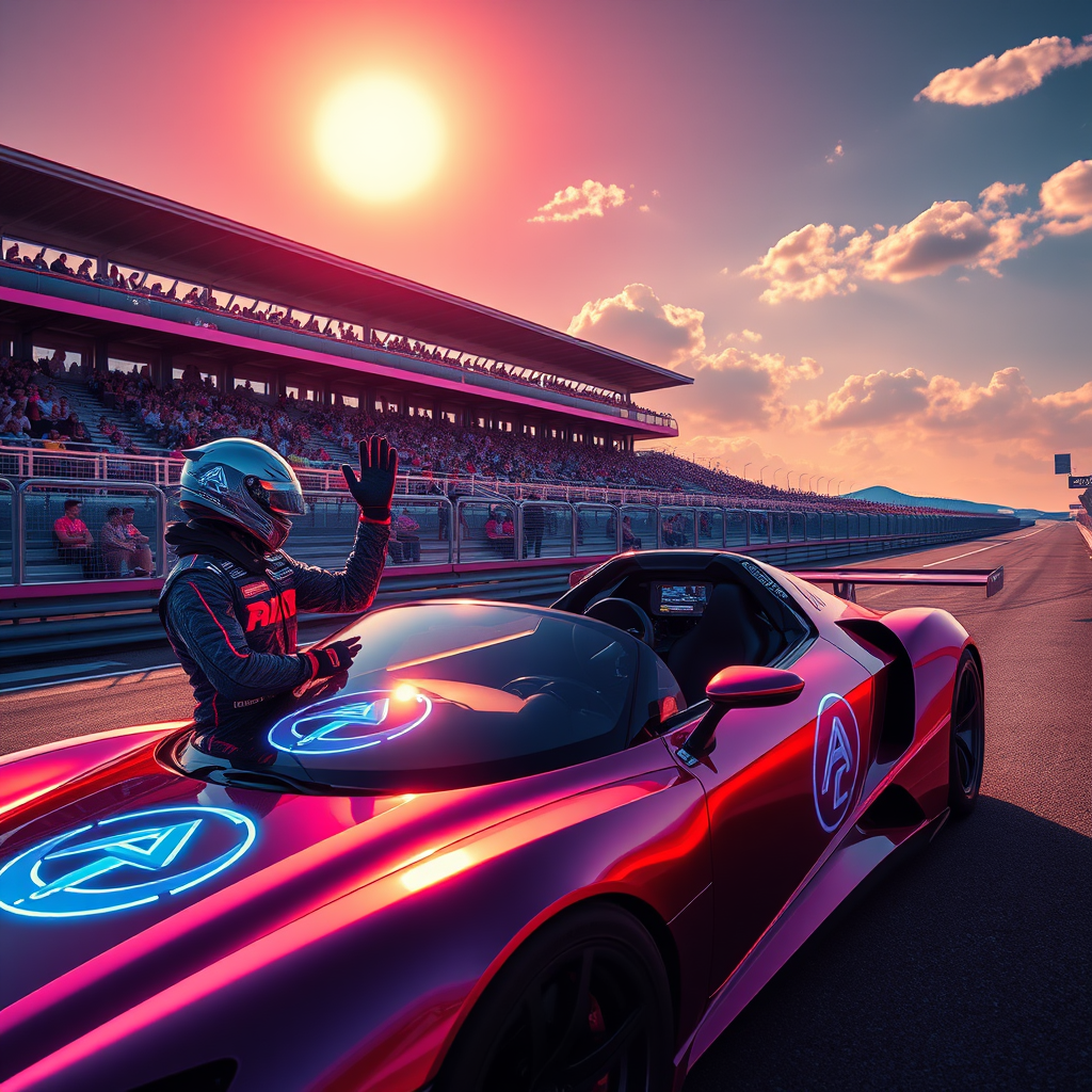 A glowing summer sun casts vibrant hues over the cyberpunk race track, where a sleek neon car adorned with the luminescent logo of an auto club awaits. Beside it, a racing driver, their suit glimmering with futuristic patterns, fastens their holographic helmet with one hand while enthusiastically waving to a sea of cheering fans with the other. The cockpit remains curiously empty, a testament to advanced autopilot technology. In the stands and beyond the high-tech track barriers, spectators clad in neon-accented attire watch eagerly. The scene is captured from a dynamic angle, slightly elevated and to the front, capturing the pulsating energy of this future-forward spectacle.
