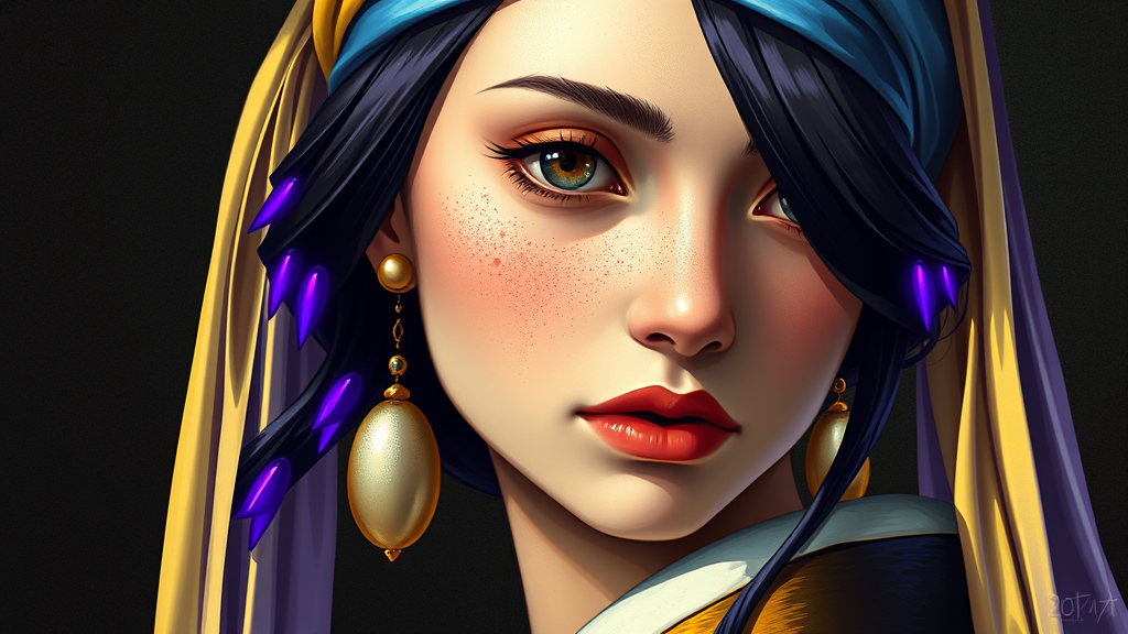 A goddess depicted in an anime-inspired style, reminiscent of "Girl with a Pearl Earring," portrayed with an ultraviolet color scheme. The artwork captures intricate details through a macro lens, blending anime aesthetics with Johannes Vermeer’s influence. The goddess is adorned in a vibrant lemon-yellow hue, representing citrus vitality. Her ethereal form is enshrined in high-quality digital painting with a meticulous focus on detail, crafted through Adobe Photoshop in high resolution. Radiant violet accents highlight her features, adding depth and a modern twist to the classical style, resulting in a visually stunning and unique portrayal.