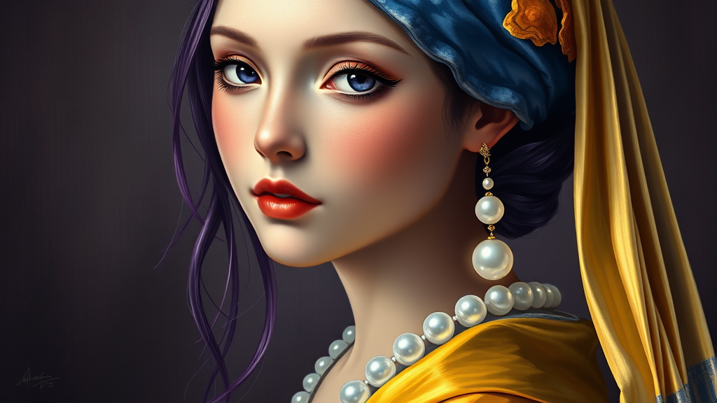 A goddess with pearl earrings depicted in an anime-inspired style, with a mystical ultraviolet color scheme, radiating an aura of ethereal beauty. The artwork unveils intricate details as if captured through a macro lens, echoing the timeless elegance of Johannes Vermeer. Her attire shimmers in a vibrant lemon-yellow hue, evoking the freshness of citrus fruits. This blend of anime aesthetics and Vermeer’s classic influence results in a captivating and unique portrayal of the divine being, crafted as high-quality digital painting in Adobe Photoshop, utilizing manual focus for breathtaking resolution.