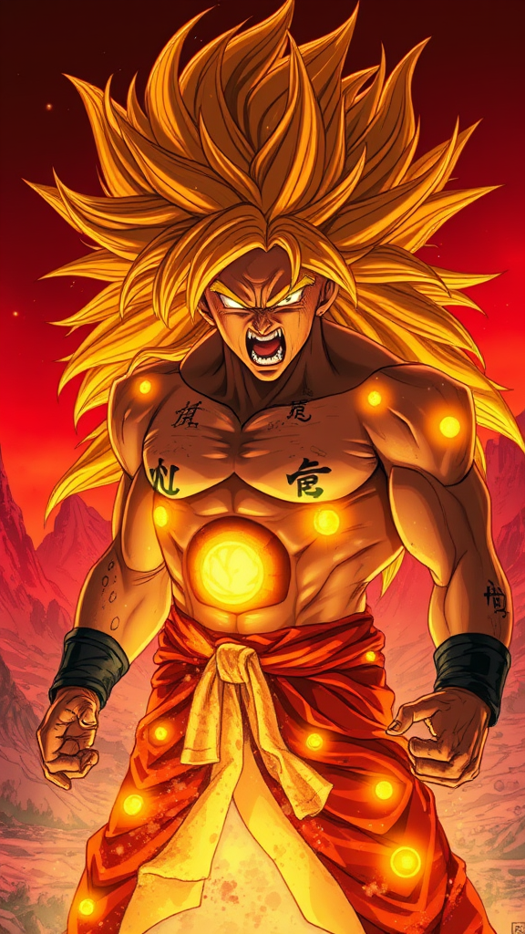 A Goku-inspired character in a close-up portrait, featuring extra long golden hair flowing wildly as he battles in a warzone. His face is contorted in extreme rage, eyes blazing with fury as he screams, charging immense energy around him. The character's body, battered, dirty, and injured, is adorned with glowing golden runes. A fiery orange and yellow aura engulfs him, reminiscent of roaring flames. He stands against a backdrop of mountainous desert terrain, captured in an epic dynamic action pose. The scene embodies a futuristic glamour, presented with a symmetrical composition. The atmosphere is filled with energy and power, influenced by a DC Comics style, with spectacular, jagged-edged backdrops and illuminated in a dramatic redshift, creating an intense and captivating visual.