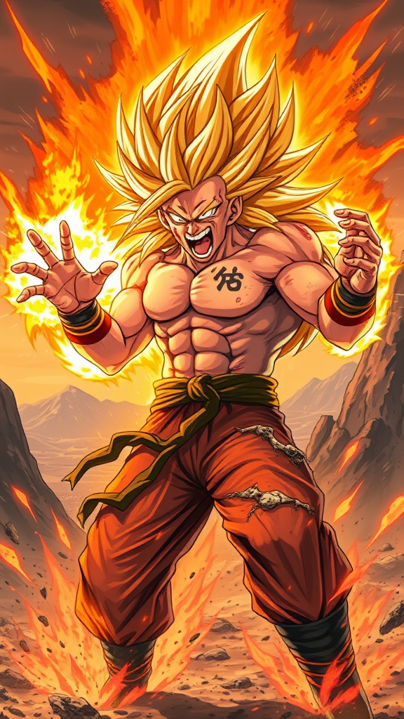 A Goku-inspired character with extraordinarily long golden hair, fiercely battling in a war, engulfed in extreme rage and berserk intensity. He's screaming as he charges massive energy around him, appearing injured and dirty with torn clothing. His serious demeanor is highlighted by his body adorned with glowing yellow runes, surrounded by a fiery orange and yellow aura. The backdrop features a desert mountain landscape, capturing him in a dynamic and epic action pose. Illustrated in a futuristic glamour style, the composition is symmetrical with a focus on redshift and energy-filled visuals, reminiscent of DC Comics. The setting is completed with spectacular, jagged-edged backdrops, adding an intense and dramatic touch to the scene.