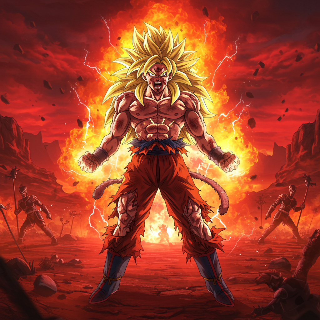 A Goku-like character with incredibly long, vibrant yellow hair stands fiercely in the middle of a chaotic battlefield, exuding an intense aura of rage and power. His piercing eyes are filled with determination, and his face is smeared with dirt and battle scars. The remnants of his shredded clothes cling to his muscular frame, accentuating the glowing yellow runes that adorn his body. An intense aura of orange and yellow flames flickers around him, pulsating with energy as he charges up his immense power. The desert landscape, dotted with towering mountains, provides an epic backdrop to this explosive scene. His pose is dynamic and full of tension, capturing the raw energy of an epic action moment. The composition is symmetrical, adding to the sense of grandeur, while the futuristic glamour style enhances the visual impact. The entire scene is illuminated by a redshift, giving it a surreal, otherworldly quality, akin to energy-filled illustrations seen in DC Comics, with jagged, electrifying edges adding to the overall drama.