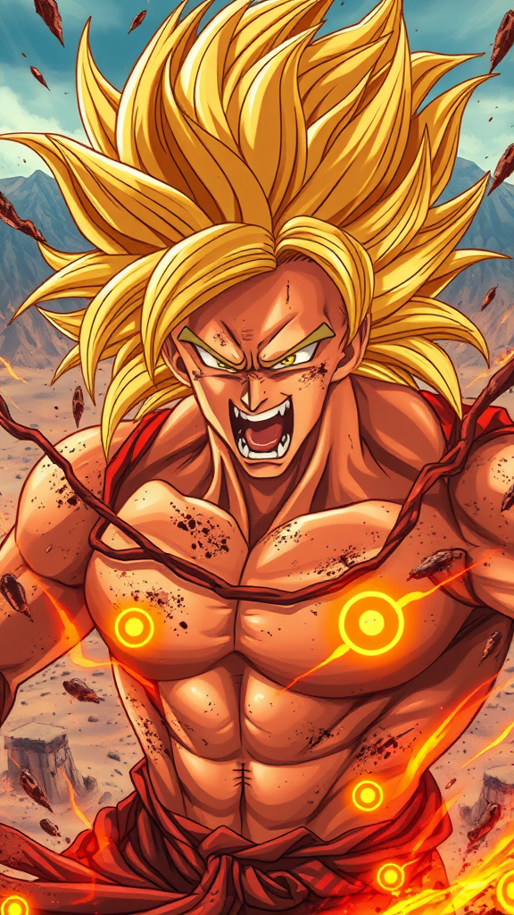 A Goku-like warrior, intense close-up portrait, featuring flowing, extra-long golden hair; he's engulfed in a fierce battlefield. His eyes blaze with extreme rage, and his scream pierces through the chaos as he charges immeasurable energy emanating palpably around him. Battle-worn, his body is adorned with glowing golden symbols, signifying his power and determination, while dirt and injuries mark his resolve. The scene exudes a serious mood, as an orange and yellow aura swirls around him like an inferno. Set against a majestic desert with looming mountains in the background, the warrior assumes a dynamic, epic action stance. The composition is beautifully symmetrical and executed in a futuristic glamour style, with a redshift effect enhancing its vibrancy. The illustration, filled with intense energy, echoes DC Comics' dramatic flair, with spectacular backdrops and sharp, jagged edges that emphasize the chaos and intensity of the moment.