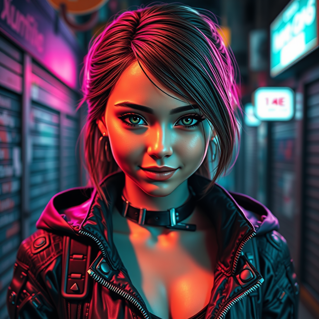 A gorgeous young cyborg girl with a mysterious smile and bright, piercing eyes stands in a slum alley. Her appearance is inspired by the futuristic style of Deus Ex Mankind Divided, showcasing a blown jacket reminiscent of fashion magazine aesthetics. The scene is illuminated by pastel lighting, enhancing her captivating presence. Natural, glossy hair frames her face, adding to her allure. The urban backdrop of a night city contrasts sharply with her vivid features, emphasizing the blend of human and machine. Avoiding imperfections, her design seamlessly integrates elements of technology and beauty.