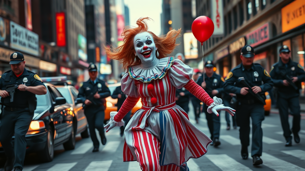 A gorgeous young woman with striking Pennywise clown makeup, her laughter echoing with a slightly manic edge, weaves through the bustling streets of New York City. The vibrant city lights dance across her colorful ensemble as her feet pound the pavement, her laughter mingling with the honking of cars and murmur of the crowd. Behind her, a group of determined cops pursues, their expressions a mix of surprise and urgency. The scene captures a surreal blend of chaos and joy in photorealistic detail, underscoring the whimsical yet intense atmosphere.