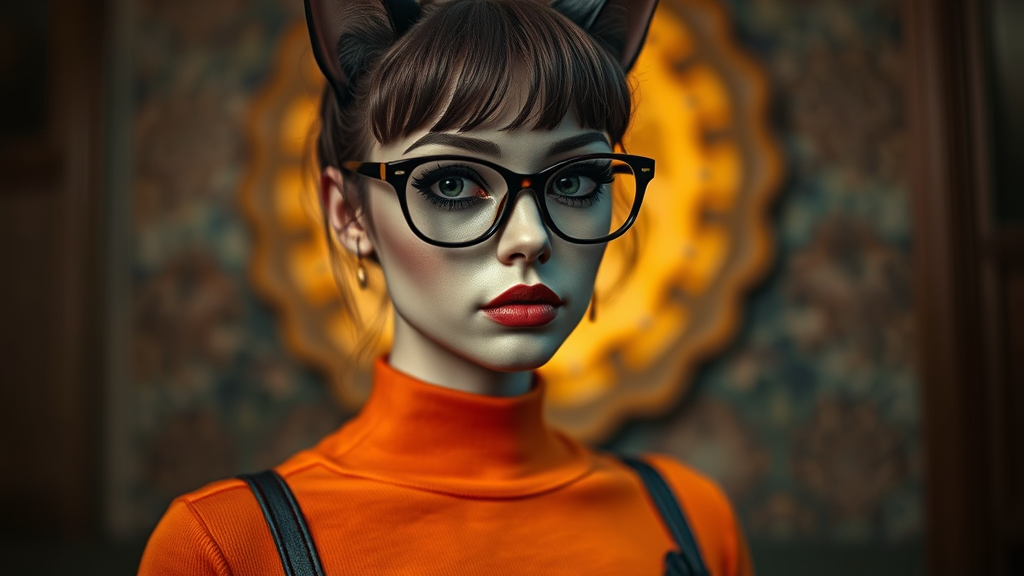 A goth-inspired woman wearing eye glasses and an orange top reminiscent of Velma from Scooby-Doo, blending the dark, moody makeup and style of gothic aesthetics with a kitschy twist. The scene evokes the detailed and atmospheric approach of Jessica Drossin, while incorporating the dramatic flair of golden age aesthetics reminiscent of Kieron Gillen. The life-size figure, crafted with the intricate nuances favored by artists like Dima Dmitriev, captures a whimsical catcore essence, framed against a backdrop that merges vintage charm with a contemporary, slightly surreal edge.