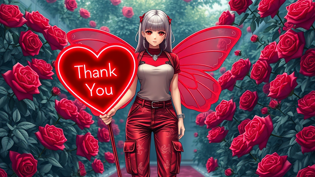 A gothic anime woman with striking silver and deep ruby-red hair stands in a captivating garden, her modest professional Gala T-shirt and cargo pant dress adorned in red and white hues, highlighting her athletic elegance. She holds a large neon heart-shaped sign-staff emblazoned with "Thank You PromptHero." Her stance is assured, with legs slightly apart at a 45-degree angle, as she gazes alluringly into the camera. Her ruby-diamond heart pendant necklace and oversized heart earrings add an air of sophistication. Graceful neon ruby-red and silver glittery butterfly wings enhance her enchanting presence. Behind her, an opulent garden blooms with vibrant neon black ruby glass roses, enveloping the scene in luxury and allure, akin to a mesmerizing illustration or painting.