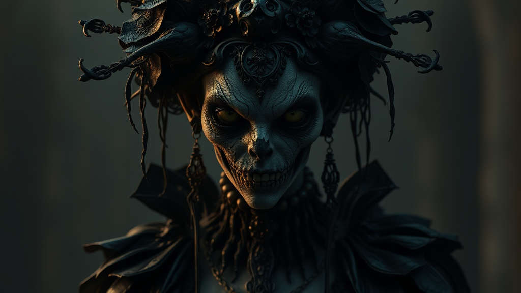 A gothic macabre grotesque female adorned in elaborate occult attire, exuding an aura of horror and mystery, dark and intricately detailed, enveloped in dramatic, moody lighting, capturing a photorealistic cinematic essence with subtle atmospheric grain, 8k resolution, tall and slender aspect ratio, version 5 enhanced.