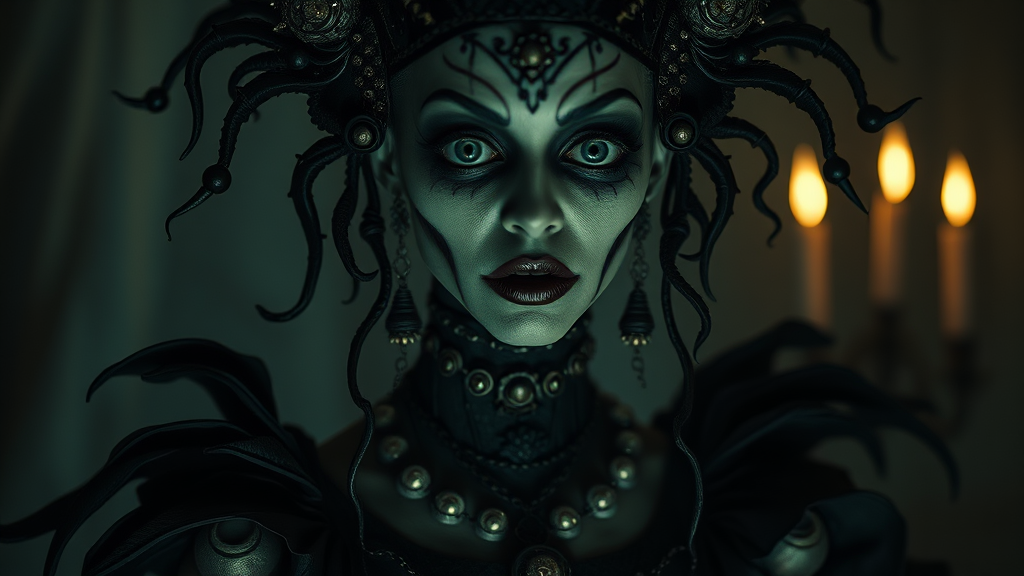 A gothic macabre grotesque woman adorned in enigmatic occult attire, exuding a sense of horror and darkness with intricate designs and elaborate details, illuminated by dramatic, moody lighting, photorealistic with a cinematic flair, capturing the essence of suspense and mystery, subtle film grain enhancing the eerie atmosphere, 8k resolution, vertical orientation, version 5.