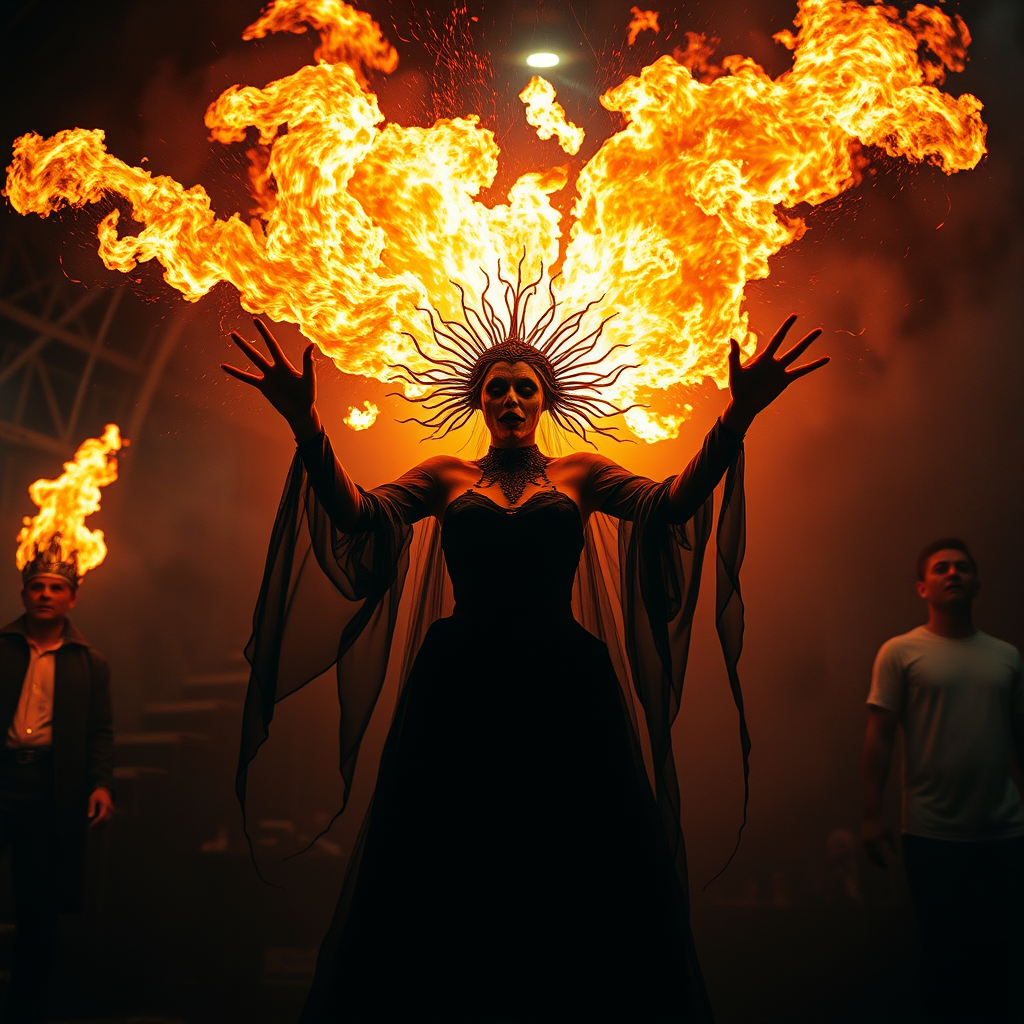 A gothic, macabre, grotesque woman unleashes a torrent of fire amidst a shadowy circus performance, surrounded by an atmosphere of horror and dark allure. The scene is intricately designed with elaborate details, capturing the dramatic lighting that casts an eerie glow on her ethereal form. The photorealistic depiction highlights the cinematic quality and texture, enveloped in a subtle cinematic noise. The haunting spectacle unfolds in ultra-high-definition, evoking a sense of awe and fascination amidst the dark carnival landscape.