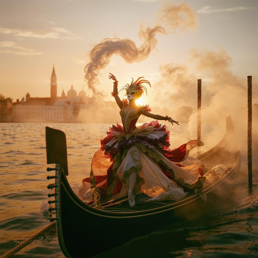 A graceful ballerina adorned in an elaborate Venetian carnival costume and ornate mask, poised elegantly on a Gondola gliding through serene waters. Cinematic fog swirls around her, adding an air of mystery. The sky is clear, with a magnificent sun setting in the distance, casting a warm, golden hue reminiscent of Kodak Portra 800 film. She strikes a dynamic pose, her movements expressive and bold, as the gentle ripples in the water reflect the grandeur of the scene.