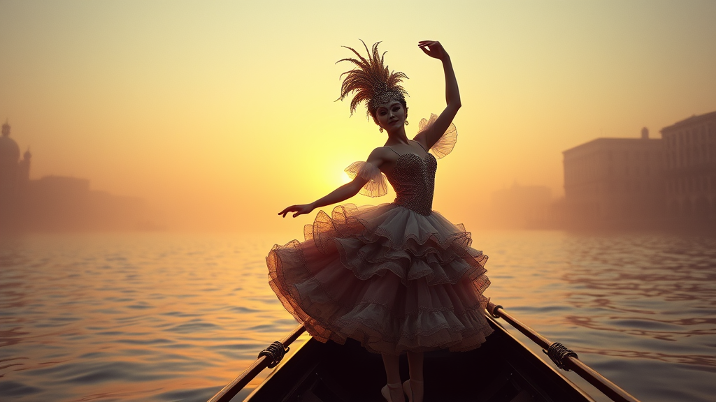 A graceful ballerina dressed in an elaborate Venetian carnival costume twirls elegantly on a Gondola gliding through tranquil waters, her face partially concealed by an ornate Venetian carnival mask. The scene is enveloped in a soft cinematic fog, as the golden sun sets on the horizon under clear skies, casting a warm glow. She stands confidently, flexing her poise and presence, reminiscent of a moment captured on Kodak Portra 800 film.