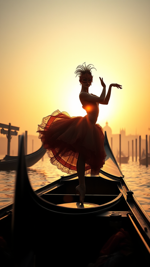 A graceful ballerina in a richly adorned Venetian carnival costume and intricate mask stands poised on a gently rocking Gondola, her silhouette striking against the cinematic fog that swirls around her. As the Gondola glides over the tranquil water, the clear sky above is painted with warm hues, the setting sun large and majestic on the horizon. She strikes a confident pose, the movement capturing the essence of elegance and strength. The scene is bathed in the nostalgic warm tones reminiscent of Kodak Portra 800, enhancing the dreamlike quality of this enchanting moment.