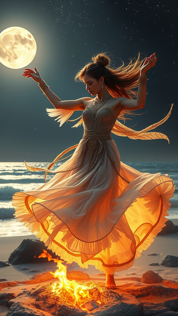 A graceful dancer adorned with shimmering feathers and intricate jewelry, twirls under the starlit sky on a moonlit beach surrounded by the glow of a crackling fire. Her movements capture the essence of a Magali Villeneuve painting, with the ethereal elegance of Eve Ventrue's style and Anna Dittmann's delicate realism. The scene is brought to life with a luminous pointillism effect, enhancing the rich textures. The lighting casts an enchanting, warm glow reminiscent of DAZ3D artistry, while influences from The Stars Art Group and Sultan Mohammed are echoed in the charred, abstract patterns merging with the dance's fiery intensity.