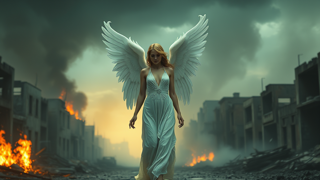 A graceful female angel with large white wings gently folded behind her, wearing an intricately detailed white dress, walks through a desolate street lined with the wreckage of destroyed buildings. The sky looms dark above, with fires flickering actively in the background, casting eerie glows that pierce through the thick volumetric fog. Subtle subsurface scattering highlights the delicate features of the angel, while ambient occlusion adds depth to the scene. It's a post-apocalyptic landscape scarred by the ruins of war, where smoke spirals upward and the heavy atmosphere conveys a sense of poignant melancholy. The scene is captured in a style that blends elements of painting and illustration, evoking a dreamlike and slightly surreal quality, as if pulled from an otherworldly vision.