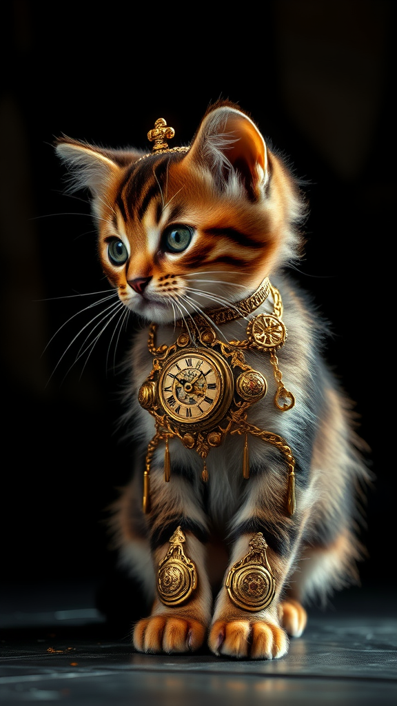 A graceful kitten adorned with intricate gold clockwork and shimmering golden filigree stands poised against an abstract darkened backdrop, invoking a sense of chiaroscuro. Its fine details captured in photorealism and hyper-realism suggest acceleration and timeless elegance. The image is rendered in cinematic quality, blending long exposure techniques with the crisp clarity of 8K HD super resolution. The composition follows a balanced 1:1 aspect ratio, infusing the scene with an exquisite fusion of art and engineering.