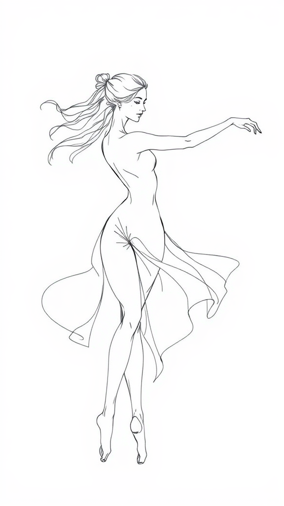 A graceful outline sketch of a woman mid-dance with fluid lines capturing her dynamic movement, delicate anatomy references highlighting the elegance of her pose, minimalistic yet detailed, focusing on the flow of motion and the grace of her extended limbs.