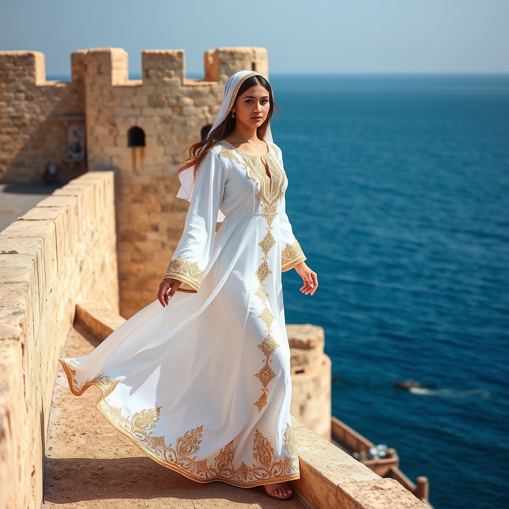 A graceful portrait of a woman in a traditional Bahraini Thobe, set against the backdrop of the historic Bahrain Fort. The Thobe is a stunning white gown, intricately embroidered with shimmering gold and silver threads. As she moves gracefully along the fort's ancient walls, the deep blue of the Arabian Gulf stretches out behind her. This blend of history and nature accentuates her timeless elegance, reflecting the rich heritage and cultural tapestry of Bahrain. The sunlight casts a warm glow, enhancing the golden embroidery and creating a captivating contrast with the fort's weathered stone.