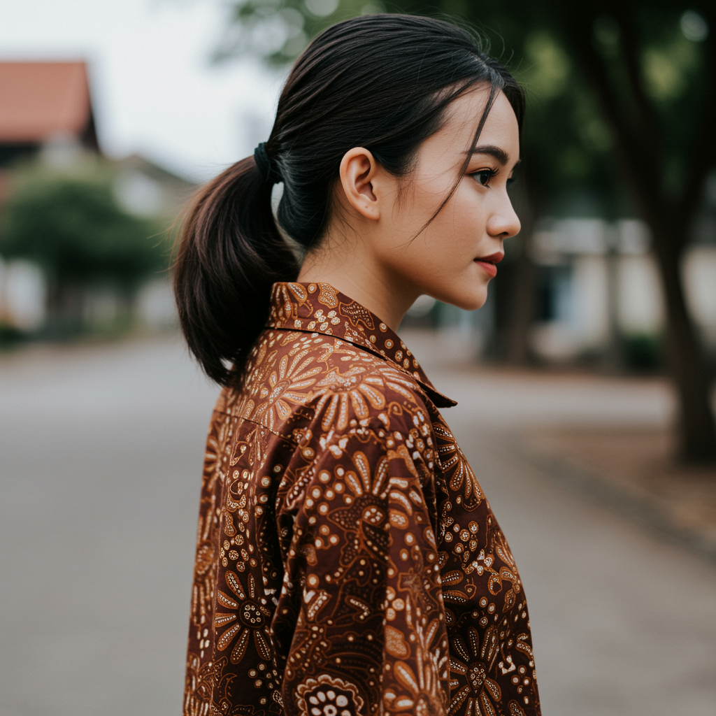 A graceful portrait of a young woman embodying elegance and modern sophistication. Her hair is styled in a sleek ponytail, with gentle tendrils escaping to delicately contour her face. She is clad in a rich chocolate brown batik shirt, subtle yet striking in its pattern, exuding an air of refined fashion sensibility. The scene captures a sense of calm assurance and trendsetting allure.