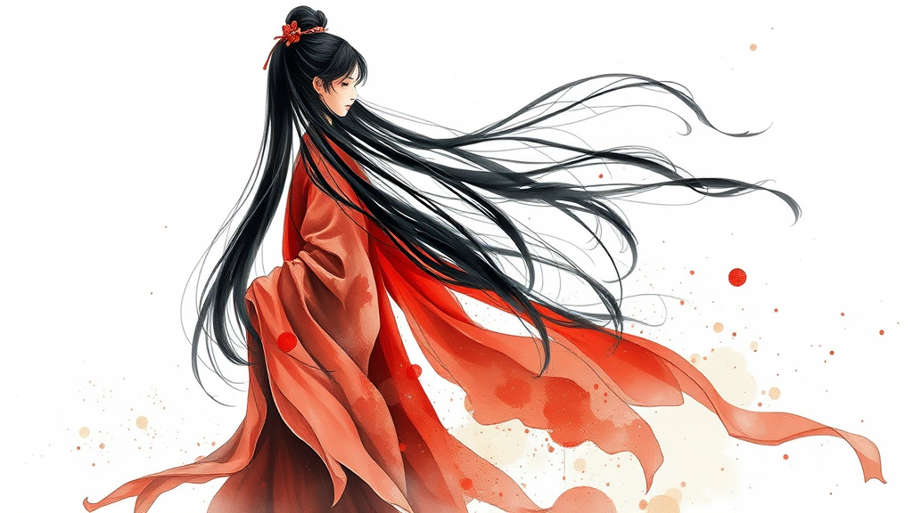 A graceful woman in a flowing red robe stands with her long black hair cascading down her back, captured in delicate ink washes that evoke an air of mystery and enchantment. The scene is reminiscent of epic fantasy with swirling mist enveloping her and hints of mythical landscapes faintly visible in the background. The artwork mirrors traditional Chinese painting techniques, with splattered ink and subtle drips giving a sense of movement and spontaneity. Set against a pristine white background, the woman wears intricately detailed traditional costumes, her form slightly blurred as if viewed through a soft focus lens. The overall composition balances elegance and mysticism, inviting the viewer into a story of ancient legends.