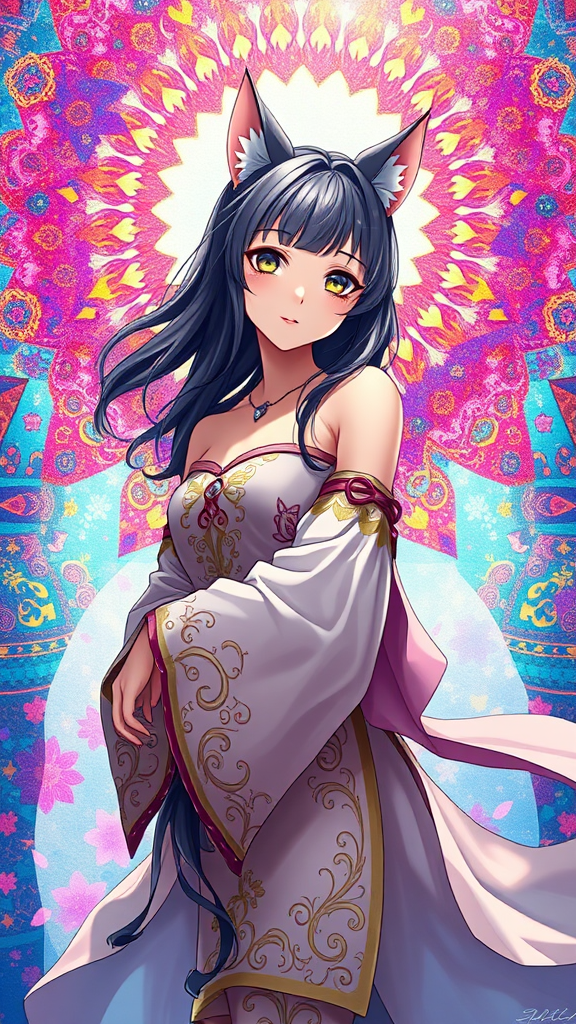 A graceful woman with playful cat ears and a flowing dress is posed elegantly against a vibrant kaleidoscope of colors, rendered in stunning anime style. Her eyes glisten with curiosity, contrasting beautifully with the intricate patterns adorning her attire. The background is a symphony of hues and abstract designs, blending fantasy and whimsy, reminiscent of Yuumei's masterful touch. This scene captures an exquisite fusion of reality and imagination, with detailed digital art showcasing an enchanting fusion of textures and light. Her pose exudes confidence and mystery within this fantastical world.