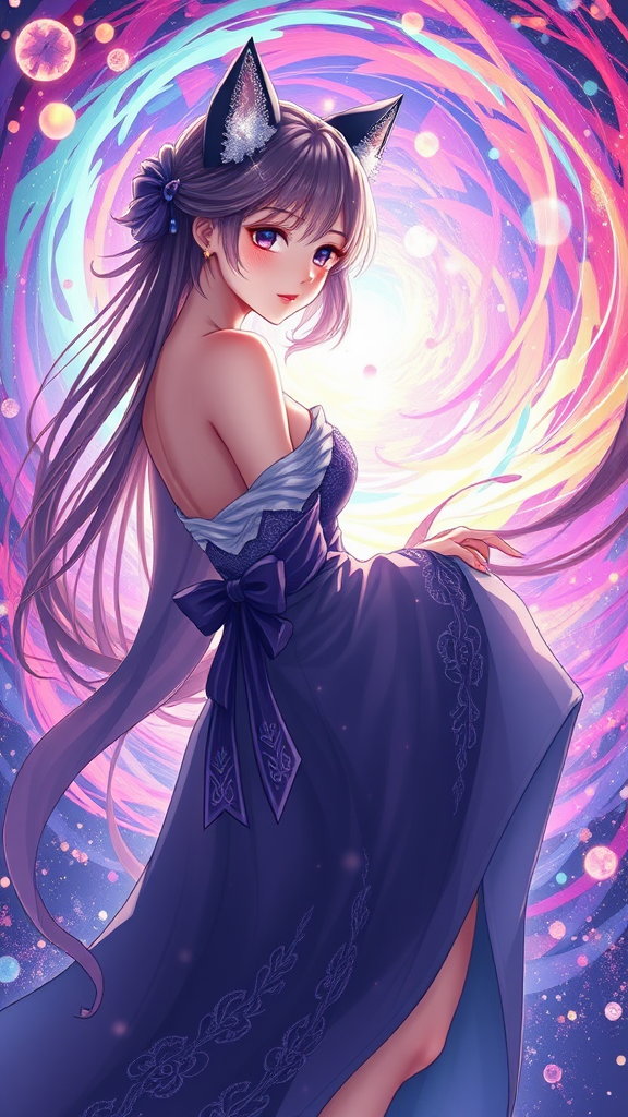 A graceful woman with shimmering cat ears dons an elegant dress, poised against a vibrant, swirling background of colors. This scene is rendered in exquisite anime style, capturing the enchanting allure of fantasy realms. The artwork is detailed and masterfully crafted, reminiscent of Yuumei's signature style, showcasing a world of fantasy. With hints of onmyoji influences, this stunning 4k digital creation combines ethereal beauty and intricate design, perfect for a mesmerizing anime wallpaper that captivates and enchants the viewer.