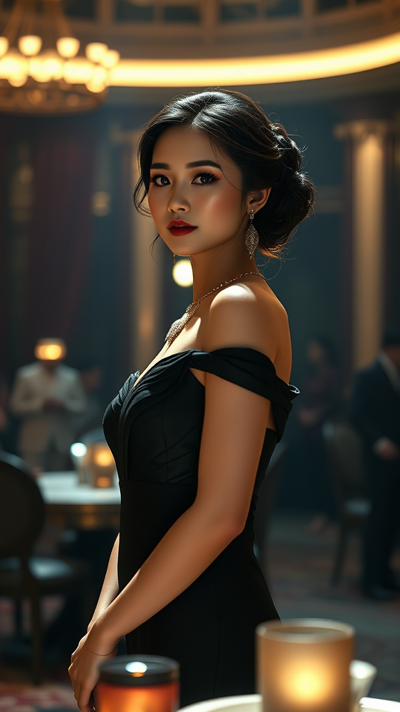 A gracefully exquisite and elegant Chinese lady at a prestigious event, adorned in a stunning black gown. The setting is luxurious and indoors, featuring a glamorous photoshoot with dramatic, ambient lighting. The concept art is rendered using Unreal Engine 5, with RTX and ray tracing technology, creating a photorealistic and visually captivating portrait.