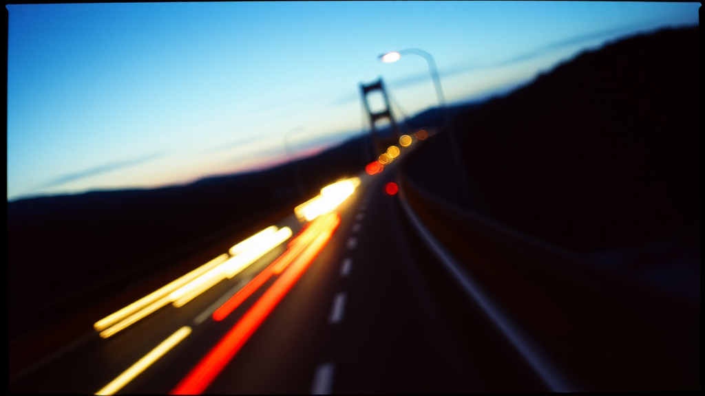 A grainy 35mm film photograph taken from a bridge at twilight, capturing the streaking lights of cars in motion with a dreamy, out-of-focus effect, and the deep, moody hues of the fading blue hour creating a cinematic atmosphere.