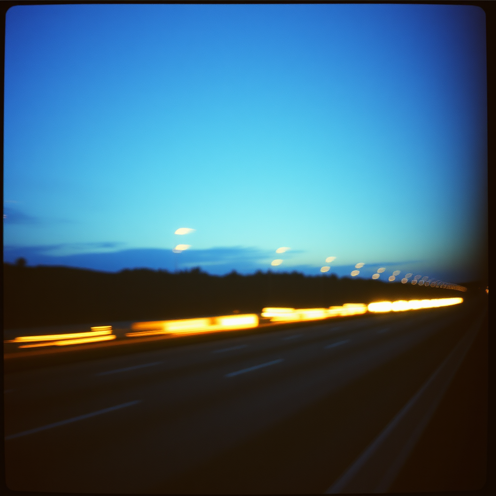 A grainy 35mm film photograph taken from a bridge at twilight captures the essence of motion with streaks of soft, blurred lights from cars below, set against the deepening blue of the sky. The scene is finished with a nostalgic cinematic texture, evoking a sense of movement and time.