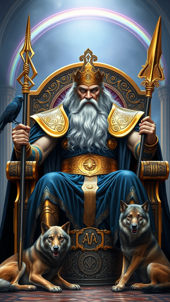 A grand and majestic portrayal of Odin, the Allfather of Norse mythology, enthroned in the resplendent hall of Asgard. His intense, single-eyed stare exudes profound wisdom and unyielding power, while his long, silvery beard cascades like shimmering moonlight. Dressed in elaborate golden armor complemented by a deep indigo cloak adorned with mysterious runic symbols, he wields the legendary spear Gungnir firmly. The throne, a masterpiece of ancient craftsmanship, is adorned with intricate patterns that subtly pulse with the energy of the Nine Realms. Ravens Huginn and Muninn are perched attentively on the armrests, while wolves Geri and Freki rest at his feet with fierce loyalty. The ethereal Bifrost arches in the background, bathing the hall in a dazzling spectrum of colors, as an aura of divine authority and enigmatic wonder permeates the space.