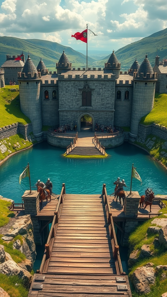 A grand medieval fortress stands majestically amidst rolling green hills, encircled by a wide, glistening moat brimming with azure water. The drawbridge is lowered, revealing a wooden pathway that invites one to marvel at the towering stone walls, guarded vigilantly by knights in gleaming armor. Amidst the fluttering banners high above, archers stand poised in their battlements, ever watchful of the distant horizon. In the bustling courtyard, blacksmiths forge new weapons as the clang of metal sings through the air, and horses neigh impatiently, sensing the tense energy of the background war. The faint echoes of clashing swords and distant battle cries serve as a constant reminder of the ongoing conflict, while inside the castle's stronghold, strategies are whispered amongst the wise council. Though the air is thick with the sense of impending siege, life within the fortress thrives, a testament to resilience and courage.