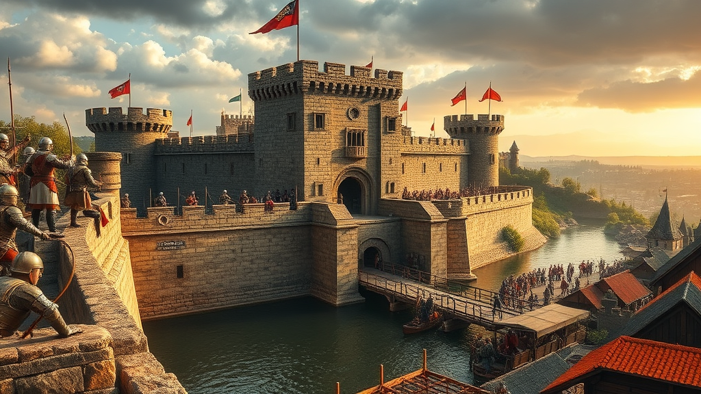 A grand medieval fortress stands proudly with its towering stone walls encircling the stronghold, a wide, deep moat shimmering under the sun, surrounds the castle, with a sturdy drawbridge poised over it. Knights in gleaming armor patrol the battlements, their helmets catching the light, while archers stand at the ready, bows in hand, peering into the distance for signs of approaching foes. Stables bustle with activity as squires tend to the horses, the sound of clashing swords rings out from the training grounds as soldiers hone their skills. Merchants and traders move briskly through the vibrant inner courtyard, their goods piled high on wooden carts. In the background, the distant rumble of war echoes ominously, casting a tense atmosphere over the bustling life of the castle, filled with the urgency and determination of medieval resilience.