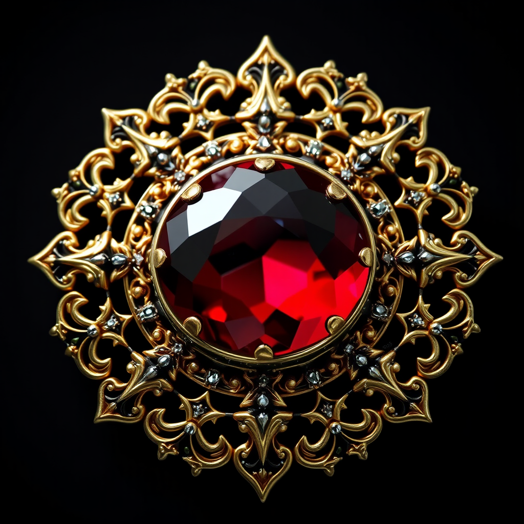 A grand, opulent brooch designed as a game item, featuring a lustrous deep crimson gemstone at its heart. Surrounding this centerpiece is an intricate arrangement of gold filigree, interwoven with delicate silver accents that catch the light with every movement. This dark fantasy masterpiece is perfectly circular, exuding an air of mysterious elegance and ancient craftsmanship, with hints of arcane power waiting to be unlocked.
