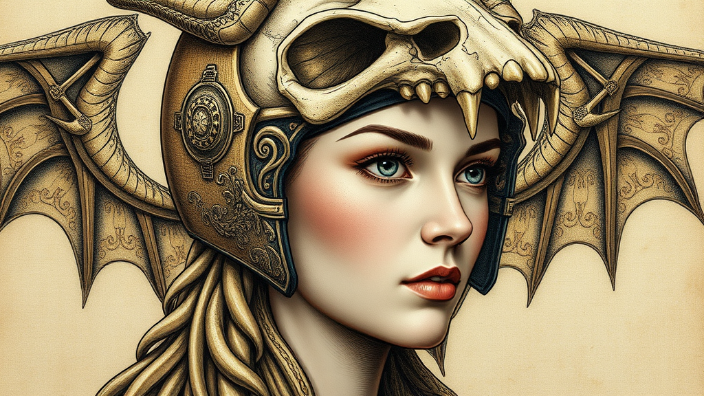 A grand portrait of a woman adorned with a skull helmet, intricately detailed in the style reminiscent of Pinturicchio, featuring elements of dragon art and elaborate ornamentation. The image showcases large-scale artistry with a palette of light bronze and bronze hues, complemented by detailed engraved line-work. The style subtly echoes the elegance of Jessie Arms Botke, blending grace with fierce power. The composition captures the essence of both timeless beauty and mythical strength, set against a softly abstracted background that enhances its majestic presence.