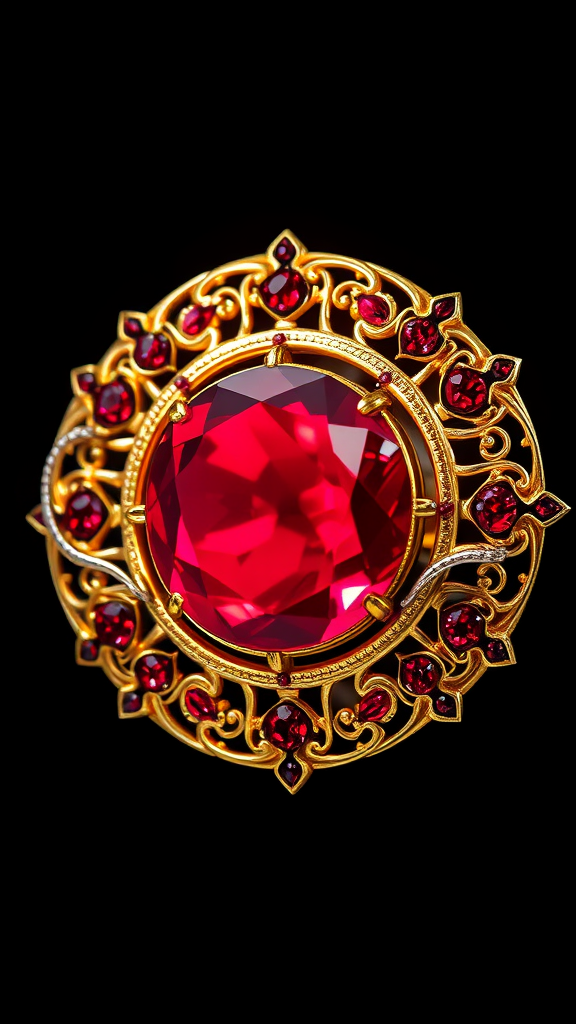 A grand Ruby brooch gleams with a mystical aura, crafted as a coveted game item. Its centerpiece is a luminous, blood-red stone encircled in gold filigree, exuding an opulent Deco elegance. Delicate silver tendrils weave intricately through the design, enhancing the brooch's allure with their subtle shimmer. In the realm of dark fantasy, this circular masterpiece is both a symbol of power and a harbinger of secrets untold.