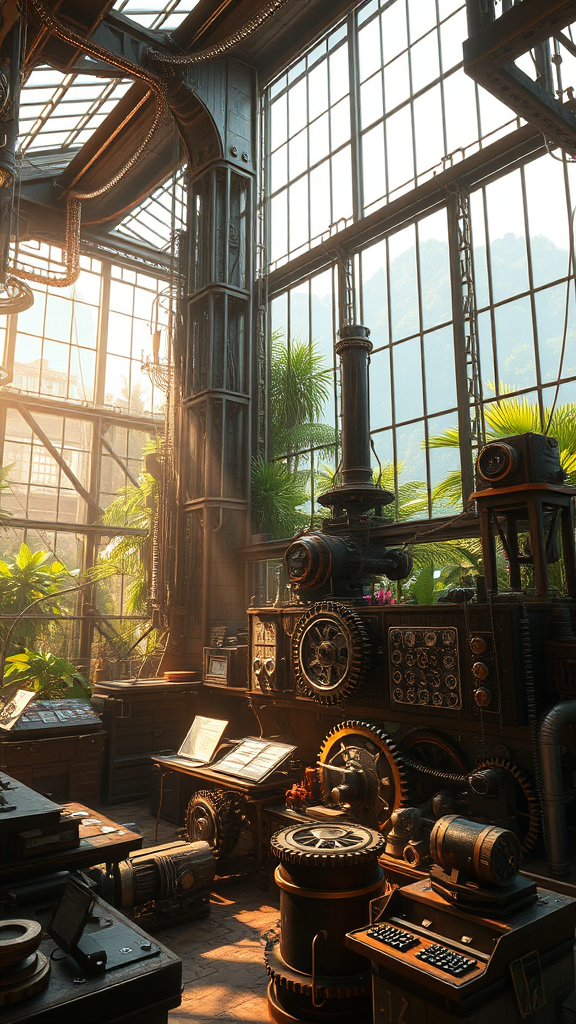 A grand steampunk science laboratory interior filled with intricate gears and towering machinery, sunlight streaming through the large greenhouse windows illuminating the workspace. Lush jungle trees and vibrant colored plants can be seen just outside, blending seamlessly with the epic landscapes beyond. The scene captures the essence of Quentin Mabille, Craig Mullins, and Romain Jouandeau's artistry, trending on ArtStation, featuring hyper-detailed, hyper-realistic elements in a matte painting style, 8k resolution. The atmosphere is a harmonious fusion of nature and innovation, evoking a sense of wonder and exploration.