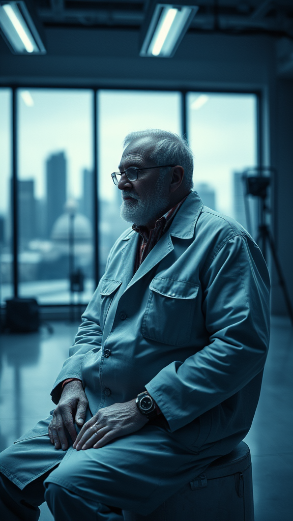 a grandfather in a high-tech lab coat with utility pockets and a futuristic watch, sitting in a minimalist studio with industrial lighting fixtures, a subtle cityscape blurred through the windows in the background, the entire scene bathed in a cold, blue-gray negative aesthetic with harsh shadows and lost details, as if the photo had been taken in a darkroom with expired film and then scanned poorly.