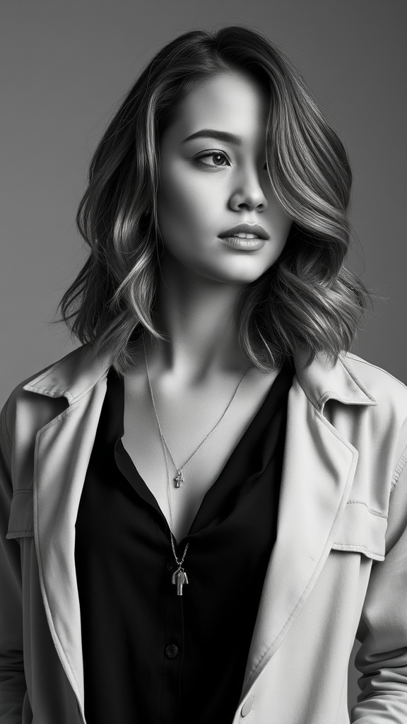 A grayscale portrait of a young woman with shoulder-length wavy hair, wearing a relaxed yet fashionable ensemble of an open light jacket over a fitted dark blouse, highlighted by a slender necklace adorned with a subtle charm. Her makeup is understated, enhancing her natural beauty, and her thoughtful gaze is softly angled away from the lens, emphasizing her innate sophistication in monochrome.